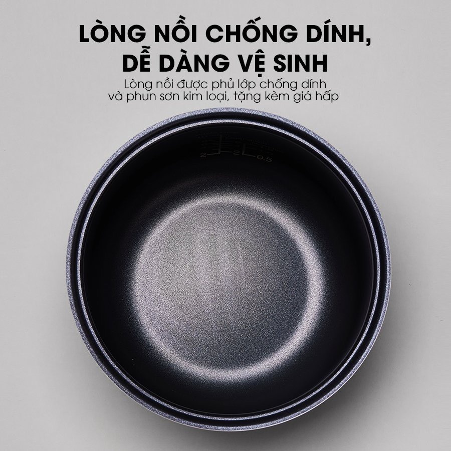 Lòng nồi sâu khoảng 14cm, đường kính 24cm, phủ lớp chống dính và phun sơn kim loại chống bong tróc. Thành nồi vô cùng dày dặn, giữ nhiệt tốt, cơm luôn nóng.